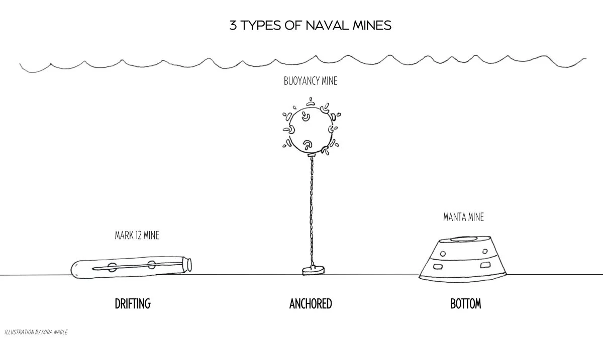 A naval mine is a self-contained underwater explosive designed to damage or destroy submarines and surface vessels. Naval mines have also been employed to restrict enemy access or force groups into specific locations. These tactics are still being used to this day. There are three main types of naval mines: drifting, bottom, and moored mines.