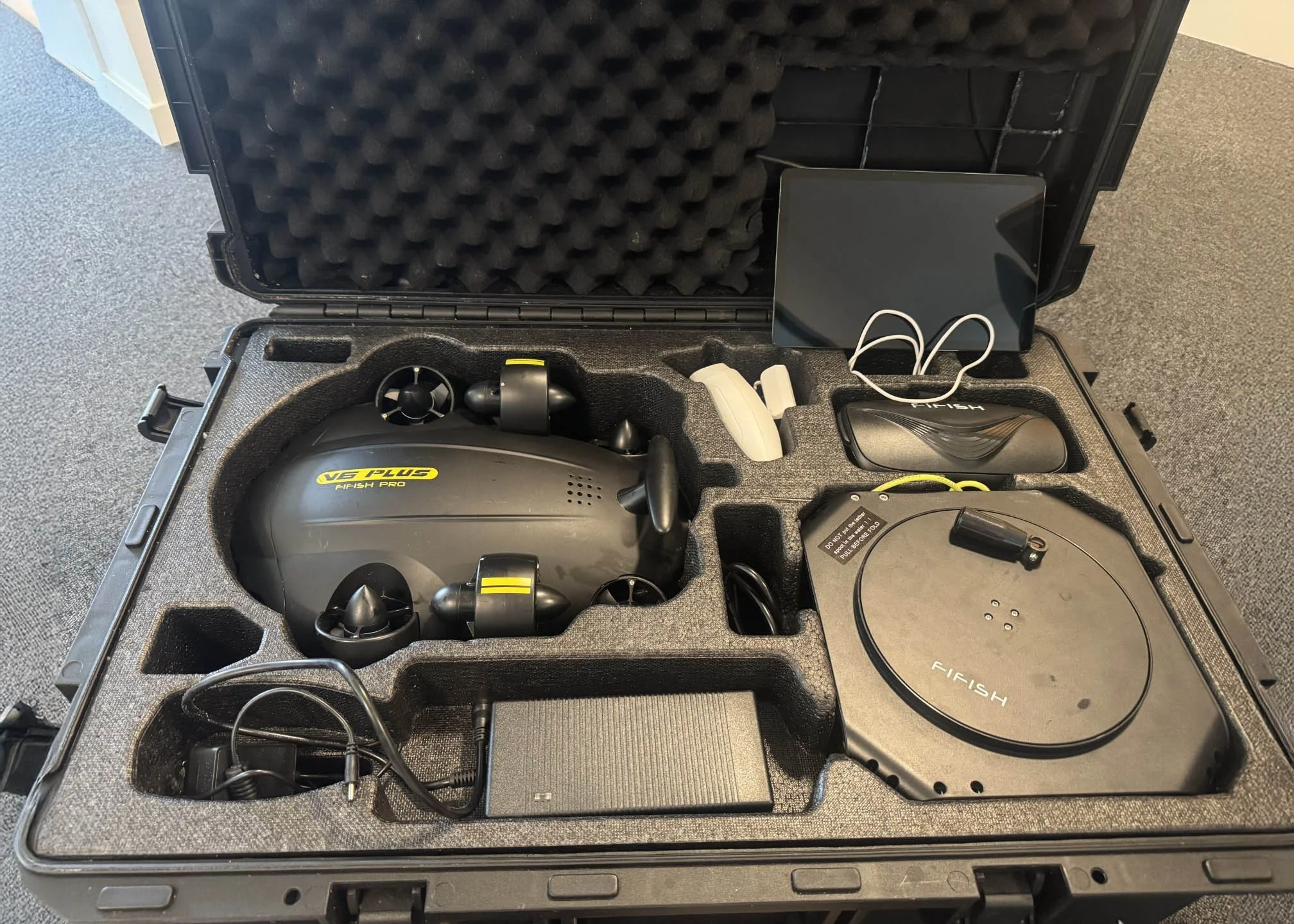The FIFISH PRO V6 PLUS comes in a rugged, custom‑fitted hard case designed for safe transport and fast deployment. Inside, each component is securely placed in precision‑cut foam to protect the system during travel and field operations. The case includes the advanced FIFISH PRO V6 PLUS underwater ROV, a high‑capacity tether spool, a responsive handheld controller, a monitor/tablet for real‑time viewing and control, a power adapter, and all essential cables.